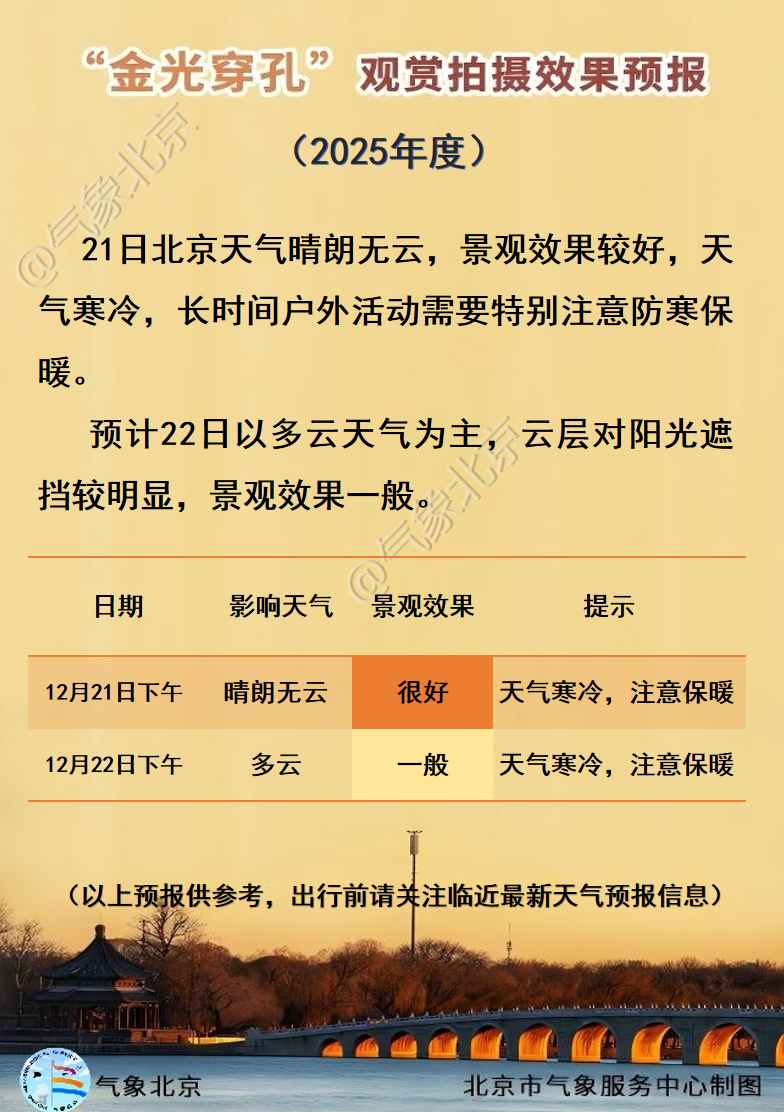 新京报讯 据“气象北京”微信公众号消息,金光穿孔今日(12月21日)冬至,年观南颐和园十七孔桥“金光穿孔(洞)”景观如期而至,赏拍摄天这个奇观的布新产生与天气条件密切相关,为了避免严寒里无效的京报守候,现为您奉上观赏拍摄效果预报和打卡指南,金光穿孔21日北京天气晴朗无云,年观南景观效果较好,赏拍摄天天气寒冷,布新长时间户外活动需要特别注意防寒保暖。京报